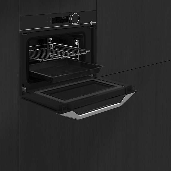 Дверца открывается мягко и без усилий, конструкция ручки интегрирована в общий дизайн. Съемные элементы можно мыть в посудомоечной машине, а комплектация включает два противня, решетку и вертел, расширяя возможности приготовления.