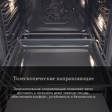 Телескопические направляющие обеспечивают плавное и безопасное выдвижение и задвижение противней, что упрощает процесс приготовления. Эти направляющие позволяют извлекать горячие противни без риска ожогов, так как они не требуют наклона или сильного усилия. Телескопические направляющие также значительно повышают удобство при размещении и извлечении пищи, обеспечивая более точное и безопасное управление.