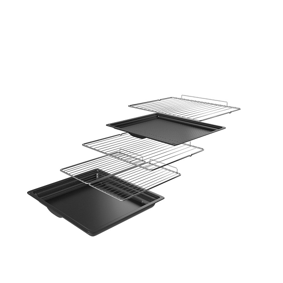 В поставку входят: решётка, комбинированный противень и гриль-решётка. Все элементы совместимы со всеми режимами работы и выдерживают высокие температуры. Можно дополнительно заказать поворотные направляющие или термощуп для расширения возможностей приготовления.