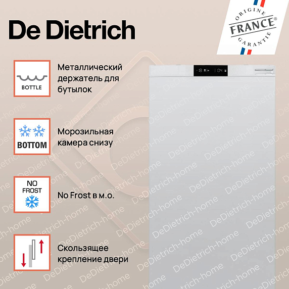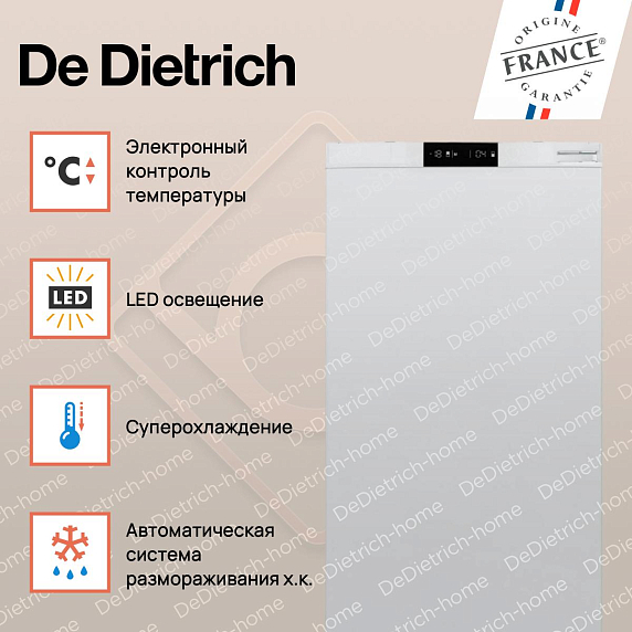 Оснащенный системой электронного управления, холодильник Де Дитрих позволяет точно настроить температуру в каждом отделении. Кроме того, встроенный дисплей с подсветкой позволяет легко контролировать все параметры работы устройства. Дополнительное удобство обеспечивает функция отложенного старта, которая позволяет программировать время начала работы холодильника.