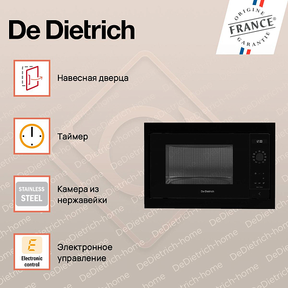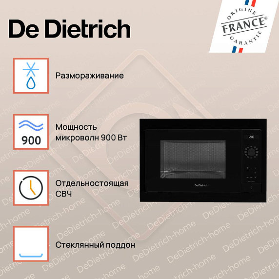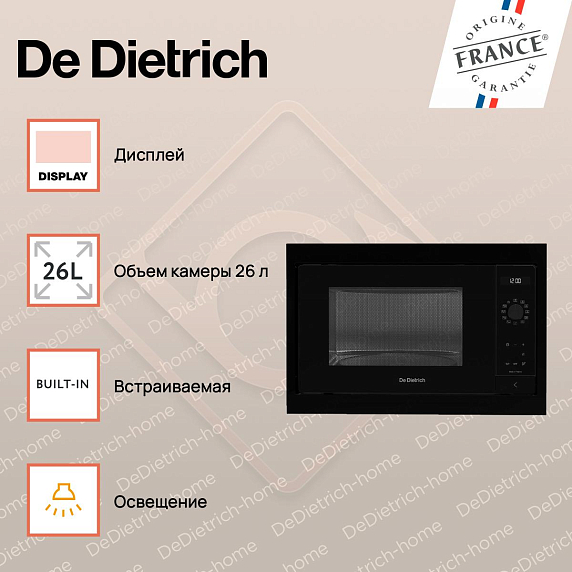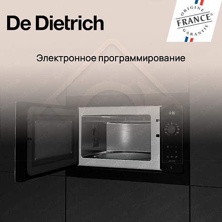 Встраиваемая микроволновая печь De Dietrich DME4310B — это высококачественное устройство, произведенное во Франции, которое сочетает в себе элегантность дизайна и превосходную функциональность. Она является частью серии INFINITE BLACK (PHILHARMONIE), которая славится своими изысканными черными оттенками и современным стилем. Модель обладает электронным управлением и удобными поворотными сенсорными переключателями, а также оснащена дисплеем для удобства использования.