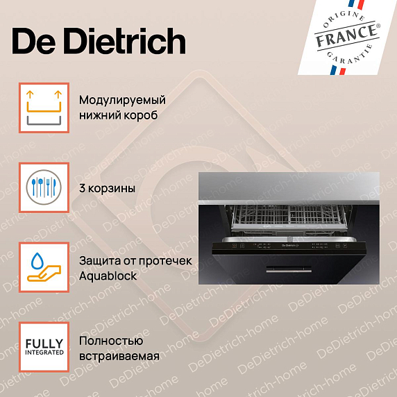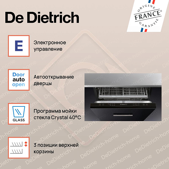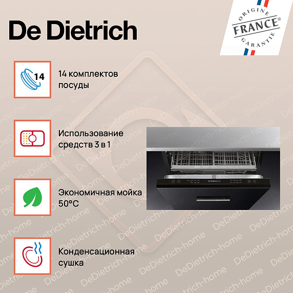 Посудомоечная машина De Dietrich DVC1434J2 — это сочетание элегантности и инновационных технологий. С первого взгляда привлекает внимание её изящный дизайн. Производитель выбрал для модели цвет черный абсолют, который придает устройству стильный и современный вид. При этом, устройство идеально впишется в любой интерьер, будь то классический или современный стиль.