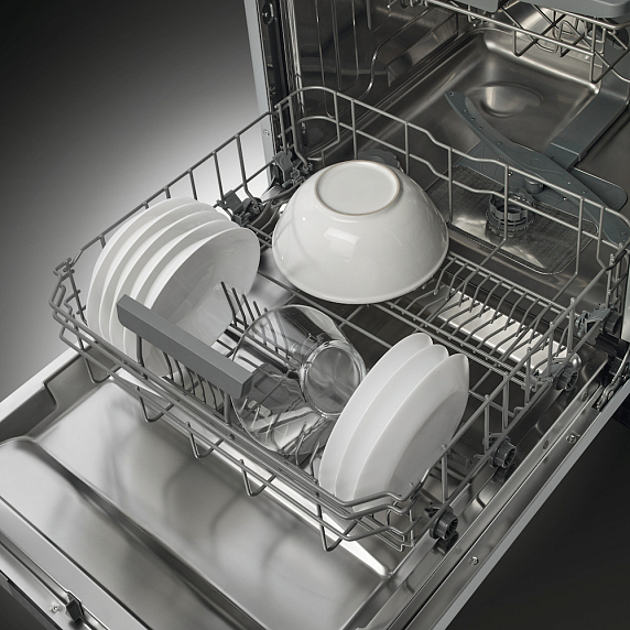 Регулируемая по высоте верхняя корзина позволяет настроить пространство внутри машины под разные размеры посуды. Это дает возможность подстраивать устройство под личные нужды, например, для мытья высоких стаканов или больших кастрюль. Такая функция повышает гибкость и удобство, улучшая эффективность мойки при любом типе загрузки.