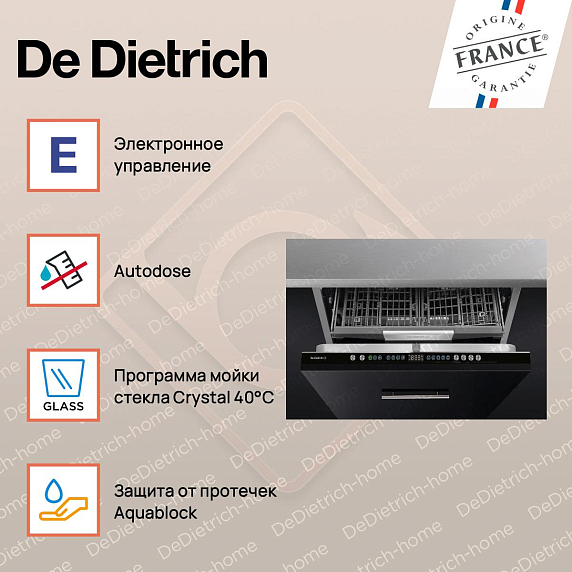 Безопасность посудомоечной машины Де Дитрих гарантируется с помощью системы защиты от протечек Aquablock, которая автоматически перекрывает подачу воды, если обнаруживает какие-либо проблемы.