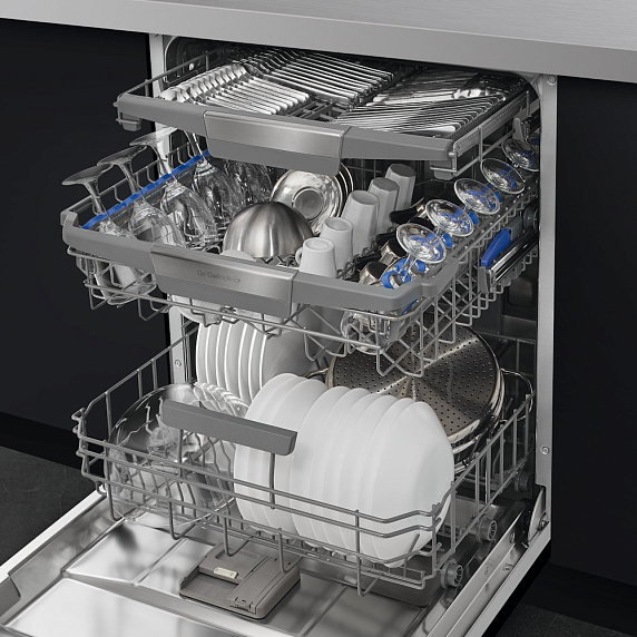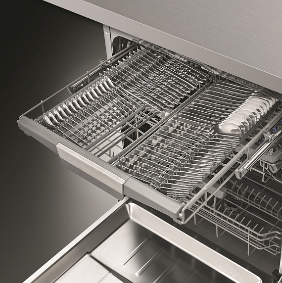 Модулируемый нижний короб позволяет изменять конфигурацию корзины для оптимального размещения крупной или нестандартной посуды. Это позволяет легко адаптировать пространство внутри посудомоечной машины, что особенно полезно для мытья больших кастрюль, сковородок или других объемных предметов. Такая система повышает удобство использования и позволяет сэкономить пространство.