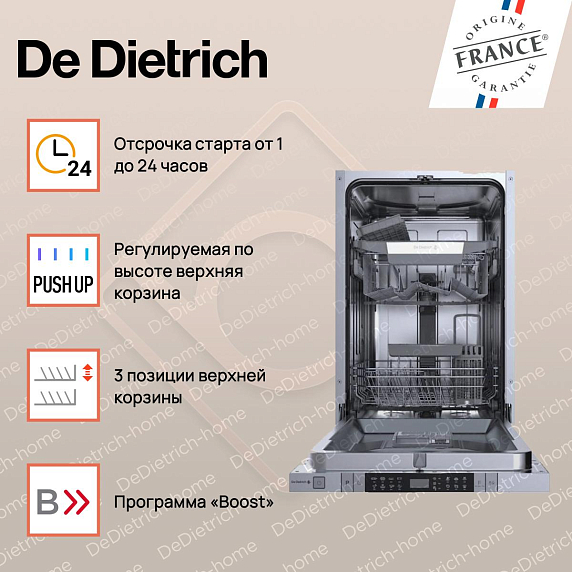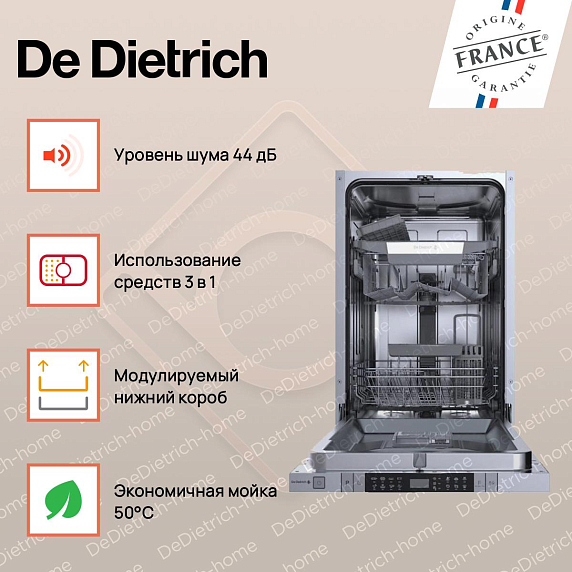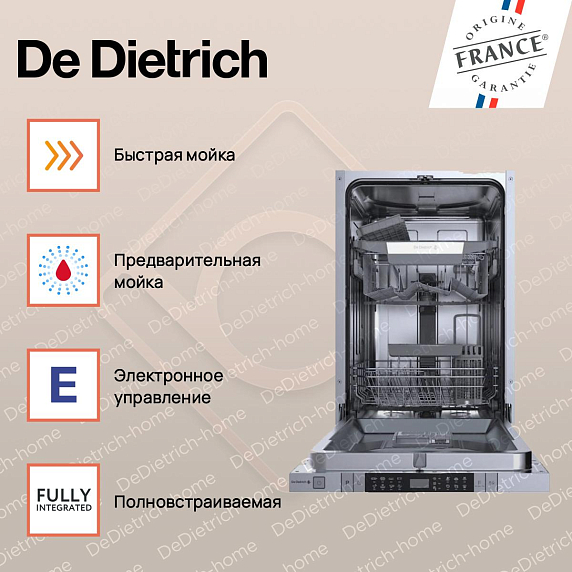 Встраиваемая посудомоечная машина De Dietrich DV301044J — это уникальное сочетание элегантного дизайна и современных технологий, которое обеспечивает непревзойденную эффективность и комфорт в использовании. Гладкие линии, натуральные оттенки и минималистичный стиль делают эту модель идеальным дополнением к любому интерьеру кухни. Особенностью этой модели является полное встраивание, что позволяет сохранить единый стиль кухонного пространства. При ширине всего 44.8 см, машина способна вместить до 10 комплектов посуды, что делает ее прекрасным решением даже для небольших кухонь. Управление машиной осуществляется с помощью удобного электронного интерфейса.