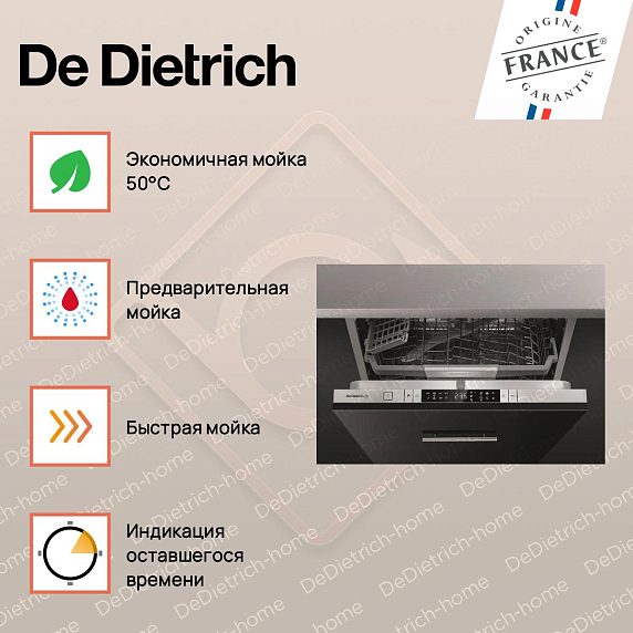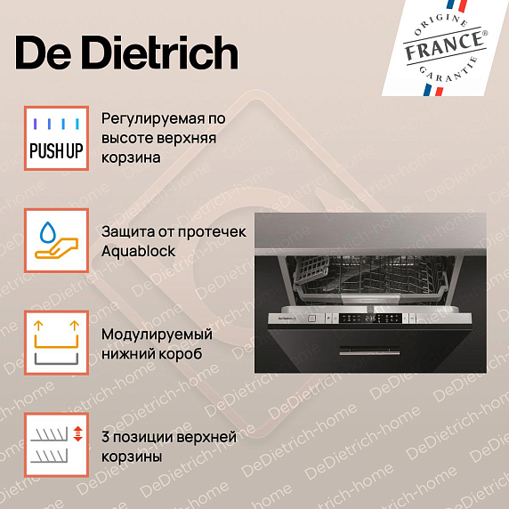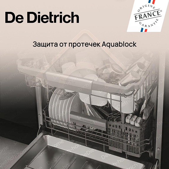 Посудомоечная машина Де Дитрих оснащена индикатором оставшегося времени, помогающим узнать, сколько времени осталось до конца работы устройства. Индикаторы уровня соли и ополаскивателя дают возможность регулировать состояние моющих средств. Безопасность гарантируется наличием системы защиты от протечек Aquablock, которая перекрывает подачу воды при обнаружении проблем.