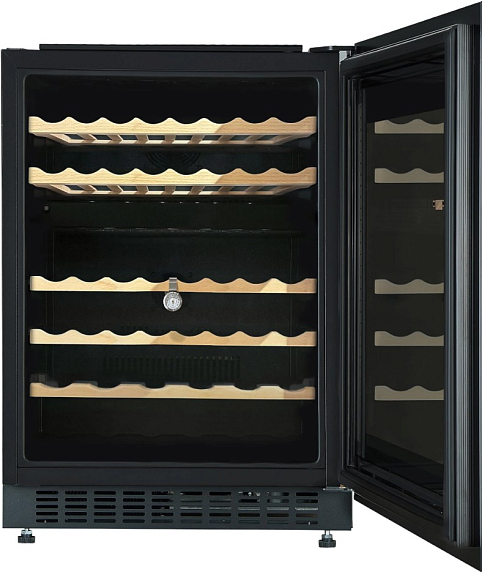 Особенностью модели является наличие двух независимых температурных зон, что позволяет хранить красные и белые вина при оптимальных условиях. Температурный режим регулируется в диапазоне от 5 до 22 °С, а электронная система управления обеспечивает точную настройку параметров. Для контроля температуры предусмотрены цифровой термометр и индикация на дисплее, что позволяет всегда поддерживать идеальный микроклимат для каждой категории напитков. Вместимость устройства составляет до 46 бутылок, размещаемых на пяти деревянных полках, которые подчеркивают премиальный характер техники и обеспечивают бережное хранение коллекции.